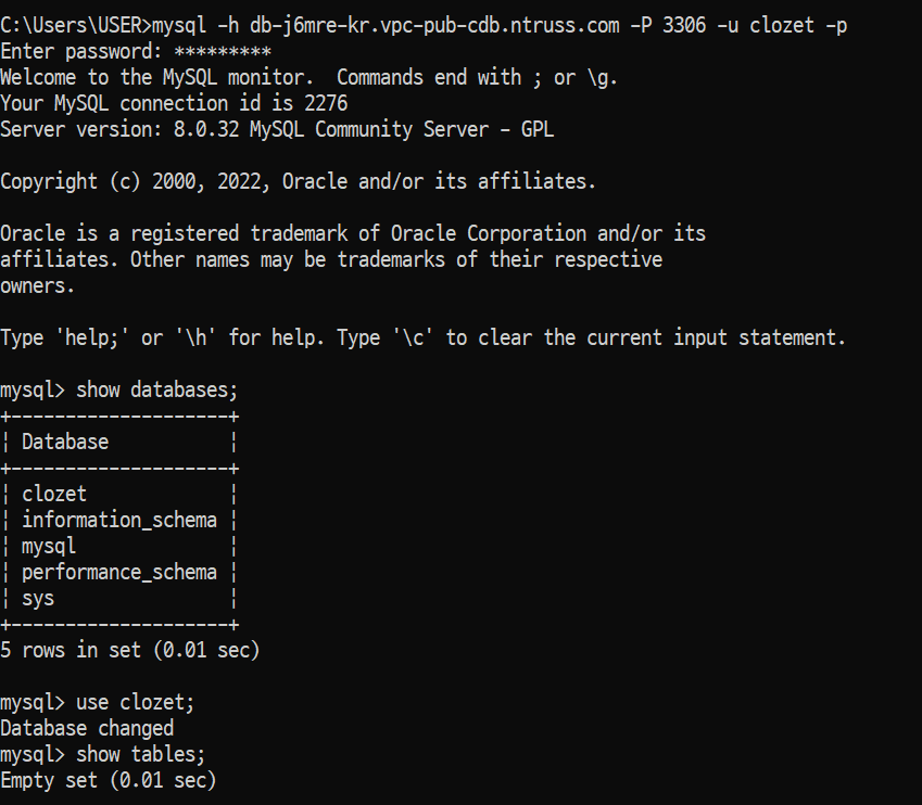 mysql -h [엔드포인트] -P 3306 -u mymasteruser -p