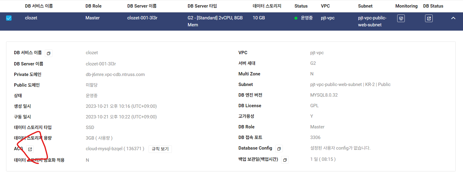 생성된 DB 서버이다. 이제 ACG 설정을 해보자