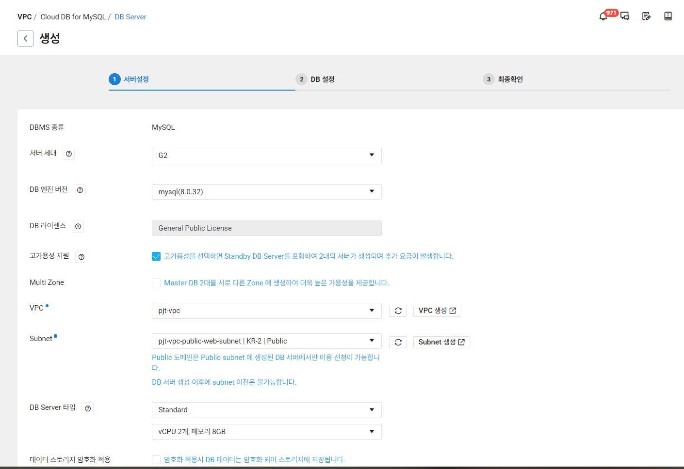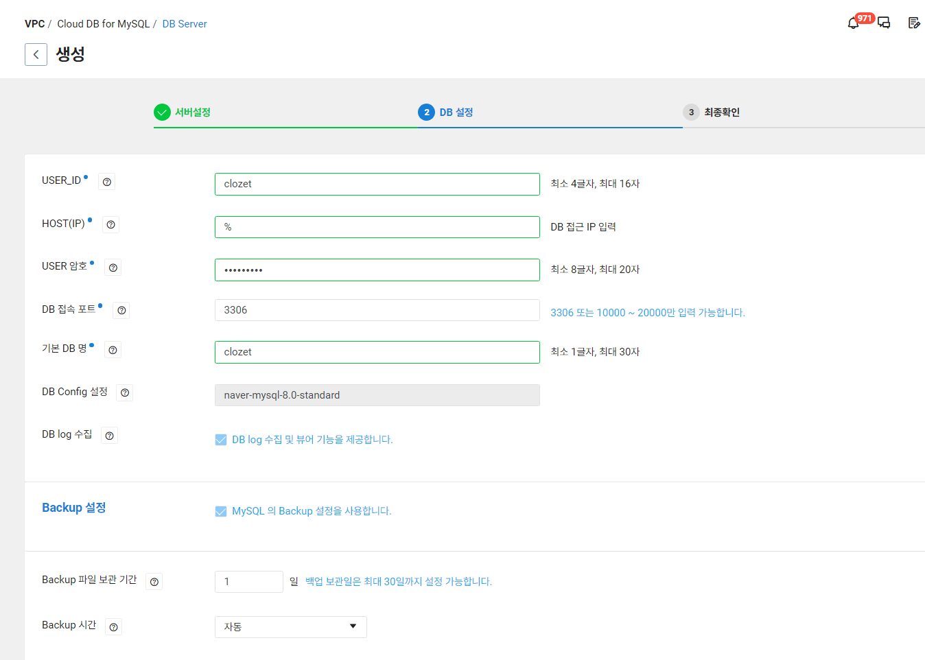 DB 이름과 계정. 비번, 접속 포트를 설정해보자. HOST(IP) 설정에는 DB에 접근을 허용할 IP대역을 입력한다. 우리는 Public 도메인을 이용하므로 모든 대역을 허용하기 위해 % 를 입력한다.