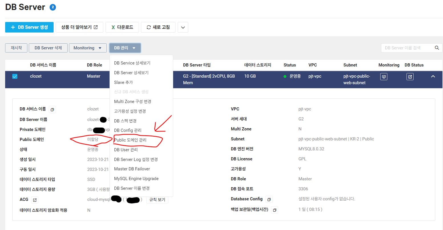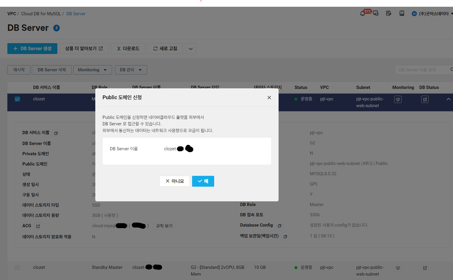 다음으로는 public 도메인을 신청해보자. Public 도메인을 신청하면 네이버 클라우드 플랫폼 외부에서 DB 서버로 접근할 수 있다.