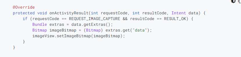 I have an android application which contains multiple activities. In one of them I'm using a button which will call the device camera : public void onClick(View view) { Intent photoIntent = ...