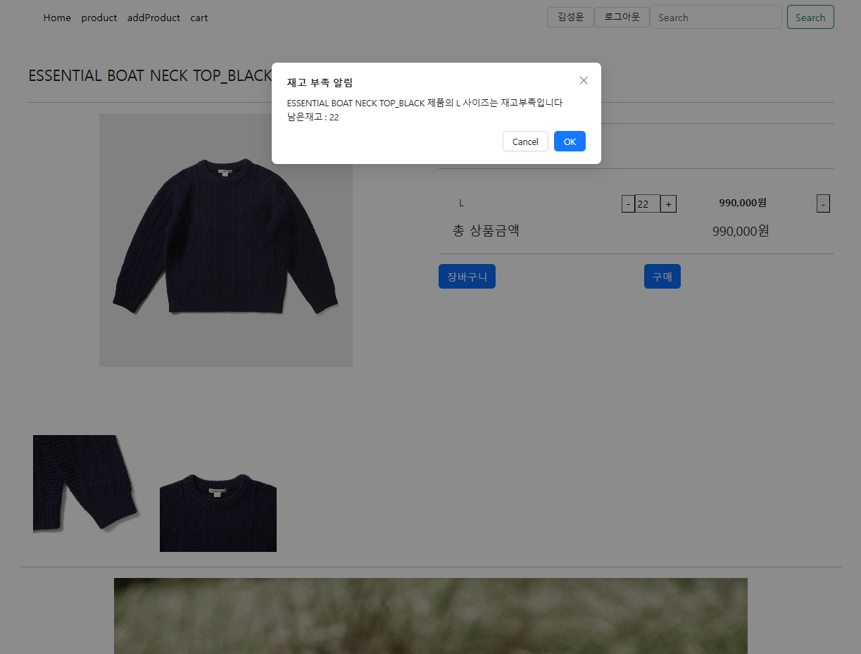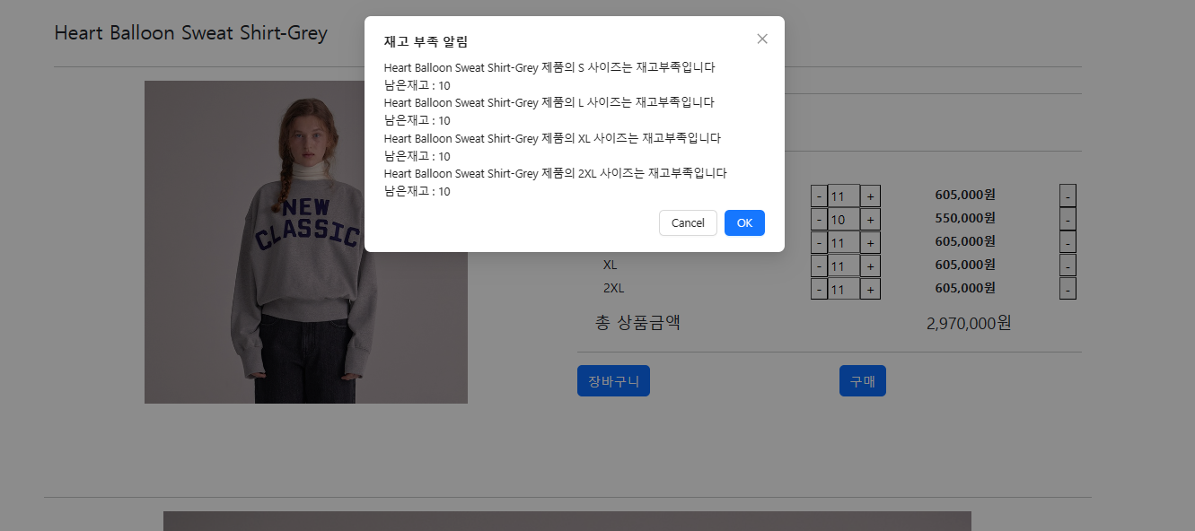 재고가 10개밖에 없는데 11개를 사려고하면 구매하려는 제품의 재고가 없다는 모달을 띄워주게된다.
